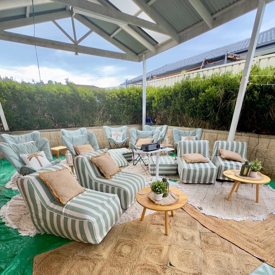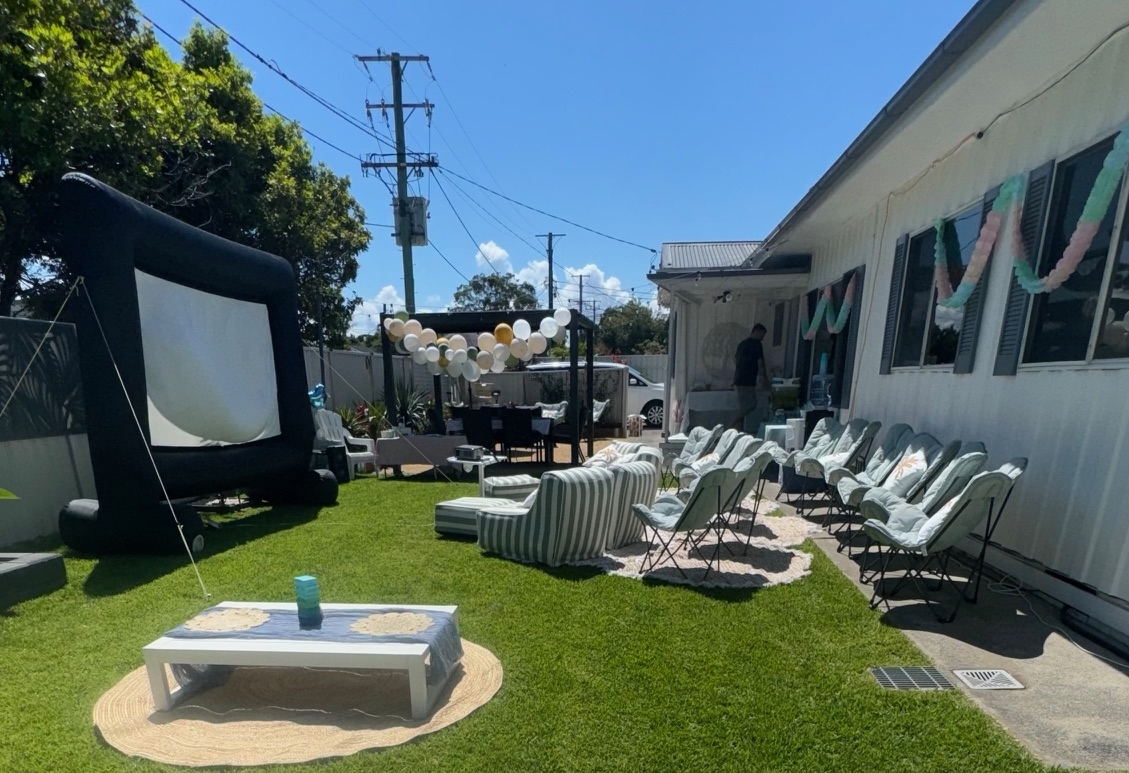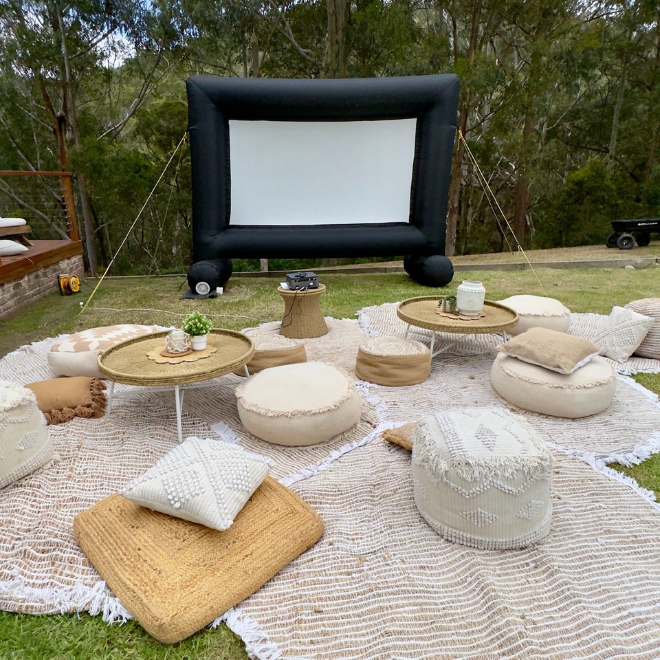 Our cinema packages includes an inflatable screen, projector, floor rugs, seating/floor cushions/ottomans, side tables and decorative touches.
