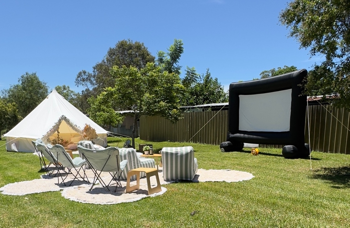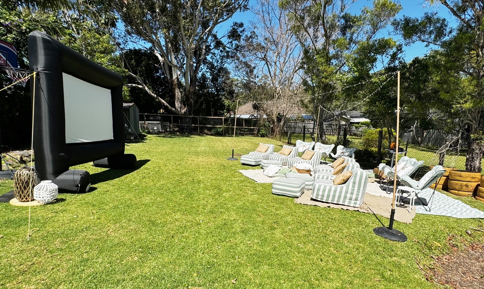 Our cinema packages includes an inflatable screen, projector, floor rugs, seating/floor cushions/ottomans, side tables and decorative touches.
