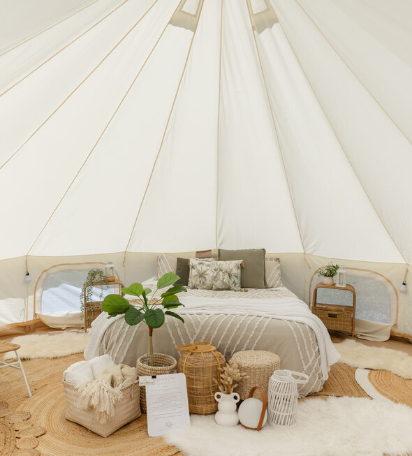 Included in our packages: Bell tent hire, air mattresses (available in double height or standard height), bedding (comprising linen, quilts, pillows, throw blankets, and decorative cushions), jute floor rugs, side tables, ottomans or stools, decorative lanterns with LED candles, floral arrangements, bath towels, LED lighting, and doormats.