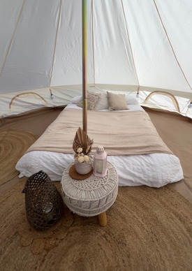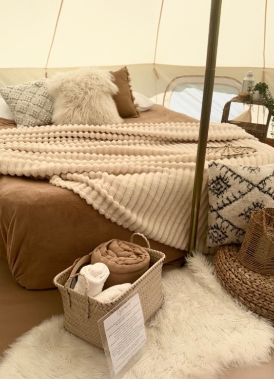 The deluxe package includes double-height airbeds (queen and/or singles), bath towels, fresh linen, bedding (quilt/blankets, throws, pillows and decorative cushions), jute floor rugs, fluffy rug, chairs, bedside tables, décor lanterns, travel amenities pack (wipes, shampoo/conditioner, body wash, tissues, sleep masks, bottled water), LED lighting, portable lamp, fairy lights on outside of tent door and other decorative touches, optional basic outdoor camp chairs.