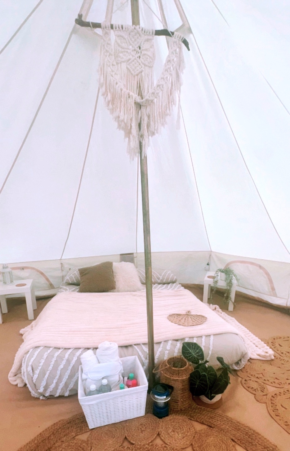 The Comfort package includes airbeds, fresh linen & bedding (quilt/blankets, pillows, décor cushions), indoor jute rugs, fluffy rug, bedside tables, décor (wall hanging, décor lantern, floral vase), LED lighting, portable lantern, fairy lights on front door, light up tent number and doormat.